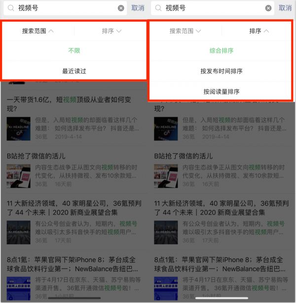 在原有的“号内搜索”入口,也有了新的优化。其一,搜索内容新增“搜索范围”选项,下设“不限”和“最近读过”两个范围;其二,搜索结果排序在综合排序选项外,新增“按发布时间排序”和“按阅读量排序”。