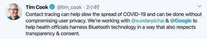 4月10日,苹果CEO库克与谷歌CEO皮猜在推特上互相@,宣布两家公司将合作推出“美国版健康码”。