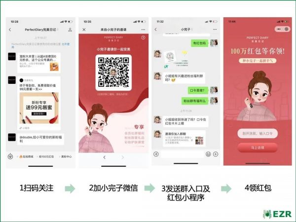 这里完美日记还是典型,无论你是线上下单还是线下收到包裹,也许在各个环节被推送了“小完子“的微信号,通过红包领现等利益引导添加小完子,再通过首单商品的优惠等利益引导到小程序下单以及进小完子社群。