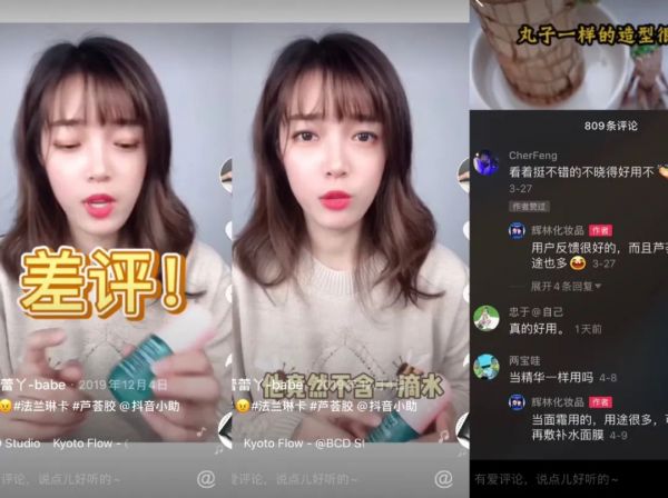 合作视频中通过高赞评论来配合评控,在美妆类产品中十分常见。法兰琳卡芦荟胶不止如此,还采用正负面口碑结合的形式提高产品的出镜率。正:有“我使用过确实有效果”类似的评论。“负”:在内容中体现“差评!点进去强调产品“竟然不加一滴水”的优势。