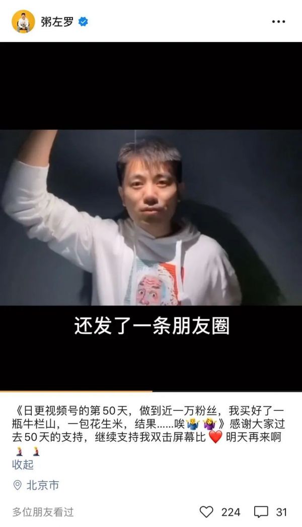 目前粥左罗的视频号主要讲个人成长,他认为在内测期,是可以“折腾”的时候,让他可以想明白自己到底适合做哪些内容。所以最近他开始尝试拍搞笑视频,接下来还会尝试各种类型风格的短视频,最终也可能继续回归讲述个人成长的定位。