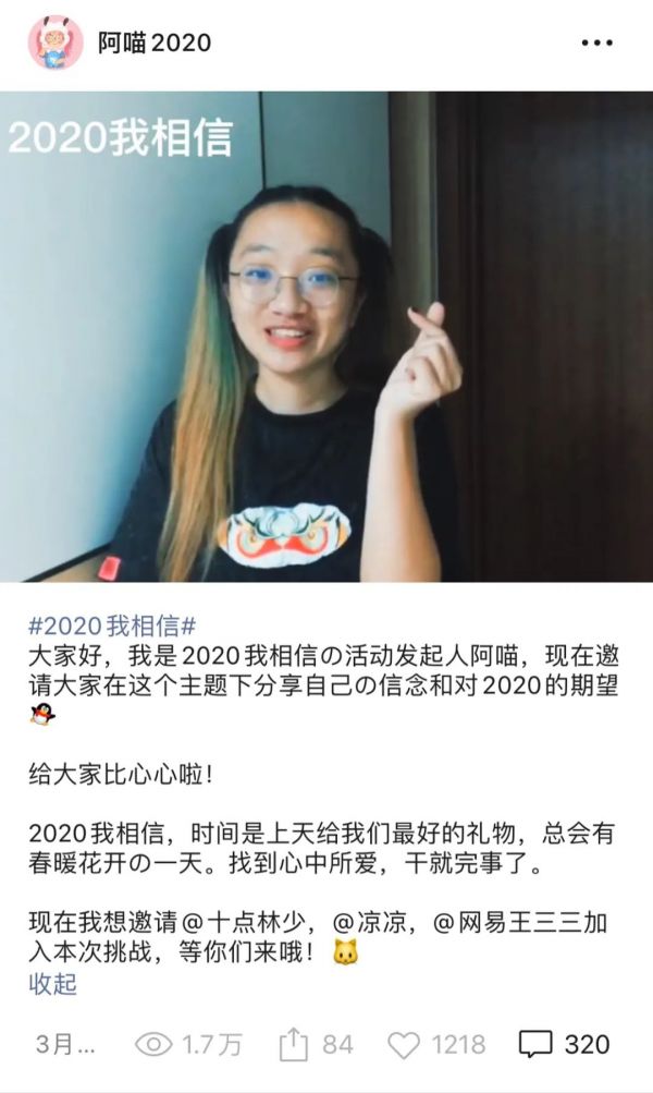 壹心理阿喵:在视频号发起#2020我相信#话题,“很可能是吸引年轻微信用户的重要入口”