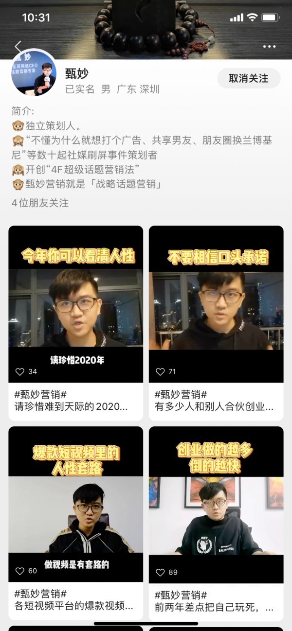 美至简CEO、南宁圈创始人甄妙每天都会拍一支视频上传到视频号上,主要发布自己的创业感悟、技能学习类内容,比如《创业做的越多倒的越快》、《分享一个引流短视频脚本模板》、《爆款短视频里的人性套路》等。
