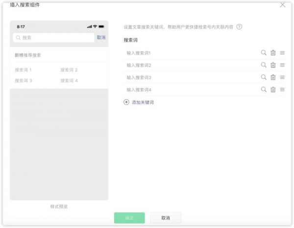 据介绍,创作者可使用微信编辑器右上方的“搜索”键来将该组件添加到内容中,每个群发图文内容都可以创建一个搜索组件,每个搜索组件最多可以配置最多6个关键词,用户可以通过关键词搜索账号内容。