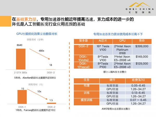 举个例子,基础算力层中,核心组成部分是专业加速器,典型的代表是 NVIDIA。他们以GPU架构为基础,提供了非常多的 AI基础算力,现在新兴的比较大的海外创业公司Graphcore和国内的基于FPGA架构的创业公司寒武纪、以及华为都在加快研发专业加速器。随着专业加速器的快速发展,以及随之而来的虚拟化、分布式发展,底层基础算力层价格的平民化,构建了AI行业发展的基础。