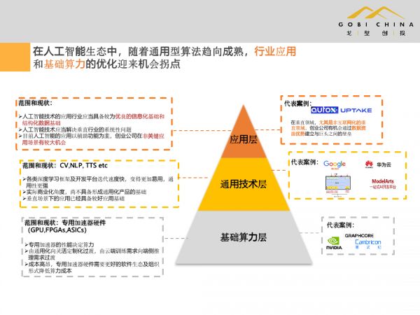 从投资人的角度,我们现在这样看待整体的架构,在人工智能领域里面,把它分成主要的三大层,从下往上分别是基础算力层、通用技术层和应用层。每一个领域其实都有非常多的投资机会和投资机遇。