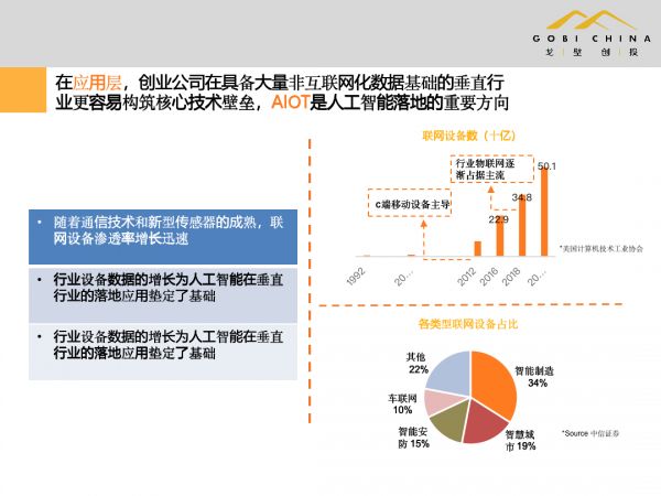 在应用层,具备大量非互联网化数据基础的垂直行业创业公司,更容易构筑核心技术壁垒。AIoT是人工智能落地的重要方向,过往在应用层,大家很多人会聊,人工智能领域到底怎么去做商业化,到底怎么能够找到创业方向。