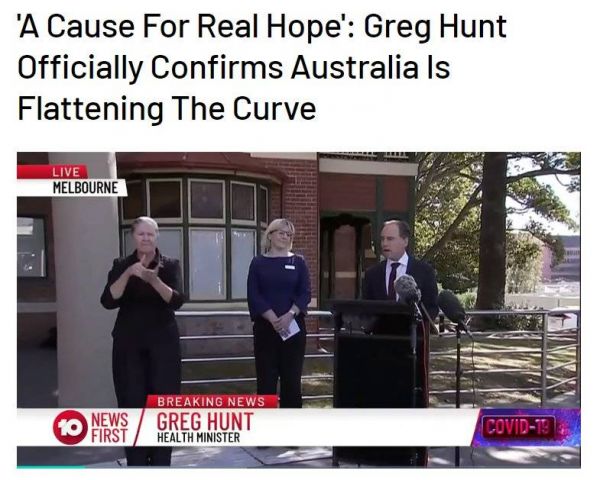 'A Cause For Real Hope': Greg Hunt Officially Confirms Australia Is Flattening The Curve. (2020). 10 daily. Retrieved 16 April 2020, from https://10daily.com.au/news/politics/a200413jxwnp/a-cause-for-real-hope-greg-hunt-officially-confirms-australia-is-flattening-the-curve-20200413