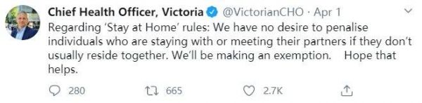 还有一个细节,那就是4月1日,维州警方表示,在执行第三阶段的社交禁令时,分居的情侣不可以串门,这是对刚发布不久的新规定的一个解释说明。但是维州的首席卫生官员在当日下午表示,考虑到这个政策不太人道,且该行为带来的大规模传播风险较低,所以允许分居情侣见面。他的建议很快就得到了采纳。