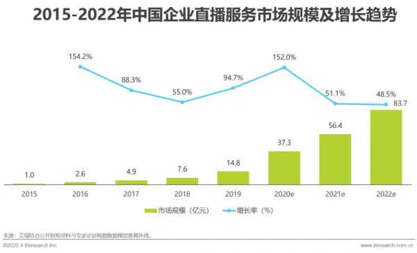 艾瑞咨询《中国企业直播服务市场研究报告》显示,受在线教育和电商直播拉动,2019年企业直播市场收入规模达到14.8亿元,预计2020年规模将超过35亿元。