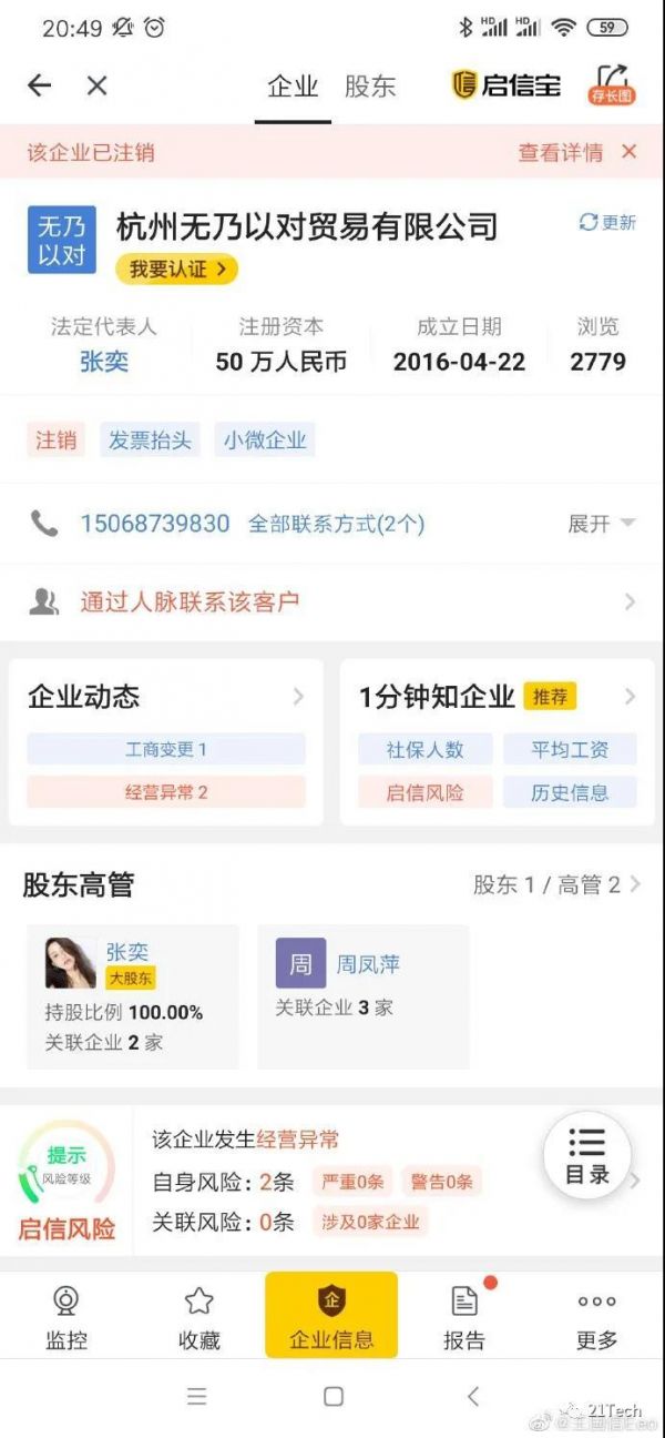 目前,张大奕关联公司2家,分别是担任法定代表人的杭州无乃以对贸易有限公司和担任投资人的大奕(上海)影视文化工作室,不过前者显示已注销。