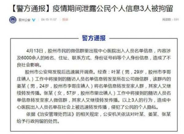 @中新网【疫情期间泄漏6000余公民个人信息,山东3人被行拘】 中新网4月19日消息,据山东胶州市公安局官方微博消息,4月13日,胶州市民的微信群里出现中心医院出入人员名单信息,内容涉及6000余人的姓名、住址、联系方式、身份证号码等个人身份信息,造成了不良社会影响。