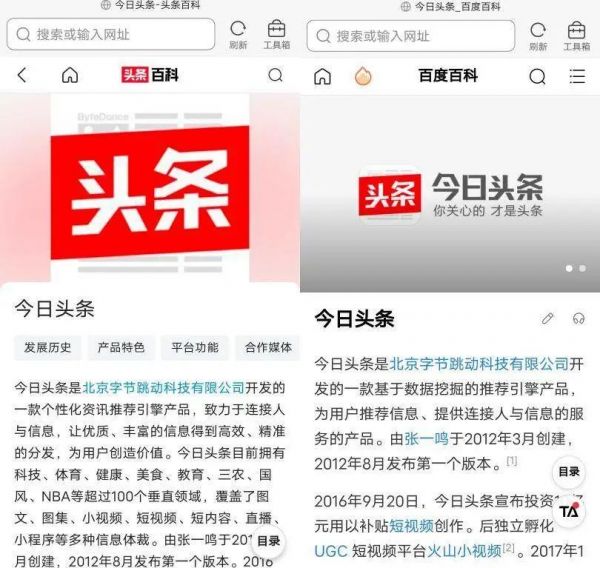 通过对比「头条百科」与「百度百科」,在两者的输入框里分别输入并搜索“今日头条”的词条后可以发现,「百度百科」在内容的叙述上更为丰富,比较客观的让用户了解所搜索的事物主体。在功能上,「百度百科」有“他说”这个信息流平台,方便用户浏览有关搜索内容的其他信息,比如新闻、动态等。不仅如此,「百度百科」还有语音朗读功能,以听书的方式让用户获取信息。