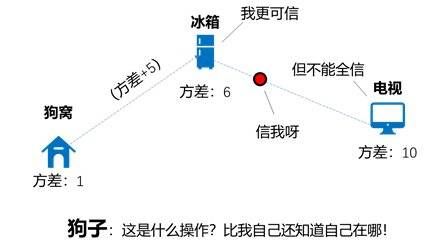(2)预测:按照运动模型(假设匀速直线运动),它当前时刻应该跑到冰箱处,但由于它脑子不好使,其实这一过程是有方差为5cm2的误差(依旧具体值是多少不知道,但概率分布知道)。由于上一时刻狗窝的方差是1cm2,因此冰箱处实际方差应该是1+5=6 cm2;