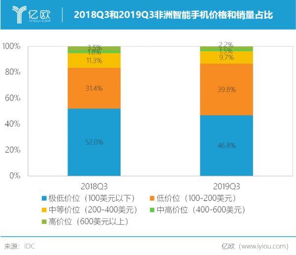 根据IDC的统计,2018年非洲市场功能机出货量自2016年以来首次下滑,从1.33亿部下滑至1.27亿部;智能机出货量虽然自2015年以来一直在9000万左右波动,但是其保有量在2018年却反超功能机。入门级智能手机作为功能机的升级替代品,成为厂商竞争的焦点。