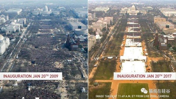 不由想起当年川普就职之初,他的顾问康威(Kellyanne Conway)生造出的一个著名词汇:“另类事实”(Alternative Facts)。当时白宫新闻秘书斯宾塞(Sean Spicer)号称川普就职典礼的观礼人数创下了历史新高,结果被媒体用现场照片和统计数据无情打脸。下图左边是奥巴马就职典礼,右边是号称“人数历史新高的”川普就职典礼。
