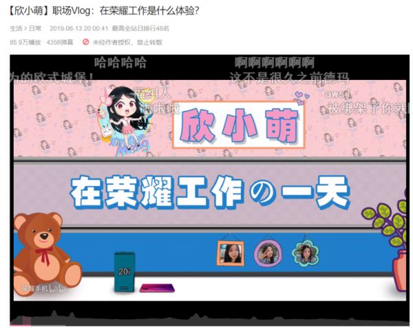 荣耀手机的官方账号里,播放量最高的一支视频,是UP主欣小萌在荣耀公司总部入职一天的vlog,这种探访大公司内部的生活区视频也很具有吸引力。