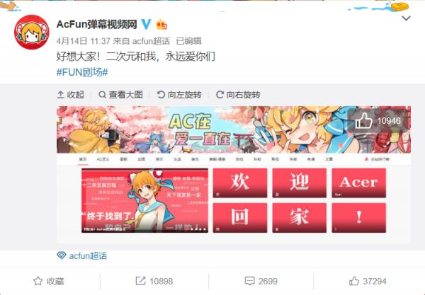一个小插曲是,B站的老朋友——A站(Acfun)最近发布了一条情怀微博,欢迎逐渐失去阵地的Acer回家,这条微博很快转了上万次。