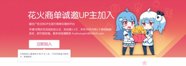花火系统类似于抖音的星图系统,入驻条件是年满18周岁且完成实名认证,粉丝数需要大于等于1万,并在30天内有一个原创视频发布。但是目前还未完全开放,仍在逐步邀请UP主入驻。