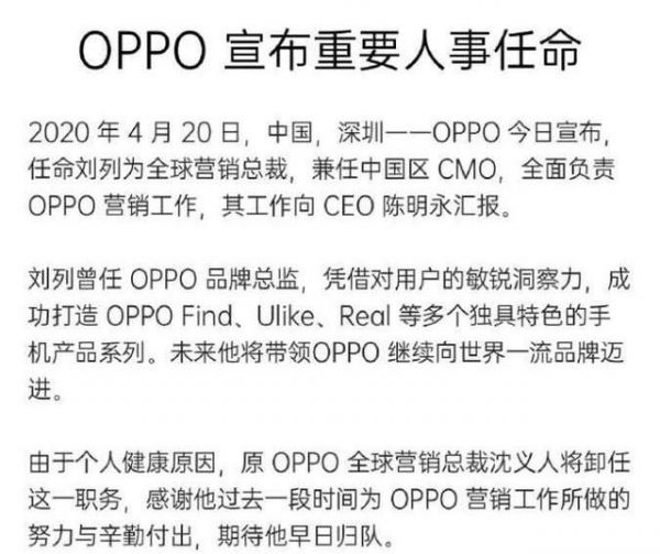 任命刘列为全球营销总裁,兼任中国区CMO,全面主持OPPO营销工作,直接向陈明永汇报,原全球营销总裁沈义人因个人健康原因辞任。