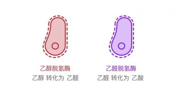 乙醇在人体内的代谢过程简单来说有两步关键反应:乙醇经乙醇脱氢酶代谢转化为乙醛,乙醛又经过乙醛脱氢酶最终变成乙酸。