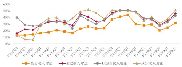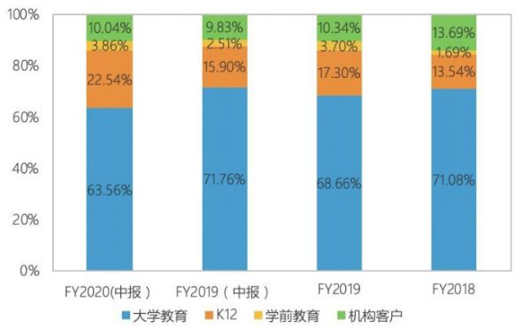 新东方在线的线上教育业务包括了大学教育、K12、学前教育和机构客户。对比2020财年中报与2019财年中报,K12教育业务营收占比增加,大学教育营收占比下降明显。