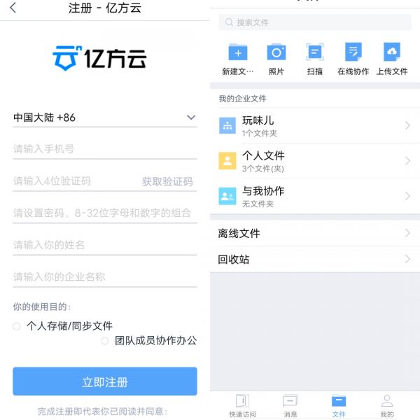 「亿方云」在移动端上需要通过手机号进行注册登录,注册时有“个人存储/同步文件”、“团队成员协作办公”等两个选项供用户选择注册,但是无论选择哪一个,登录进入「亿方云」后,功能和界面都是一样的。