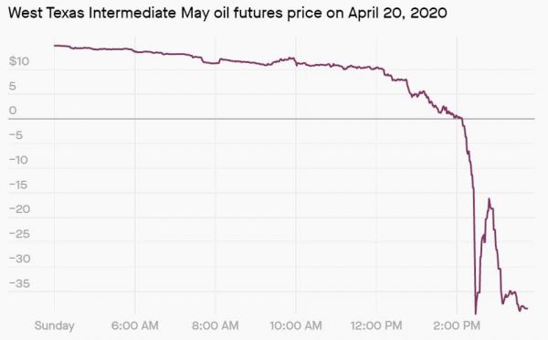 隔夜原油市场出现了极为历史性的一幕: WTI5月合约交割在即,因为需求数据大降、存储难度陡增等问题,5月合约一路暴跌,接连跌穿从10美元到1美元九道整数位心理关口,在距收盘不到半小时前跌为负值,日内跌幅超过100%,临收盘前一度跌至-43美元/桶,最终收报-37.63美元/桶。
