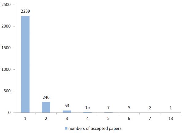 ICLR 2020 接收录用的 687 篇论文,共来自 2566 位作者。其中 5 篇以上(包括)入选的作者共有 15 位,入选 4 篇的作者有 15 位,入选 3 篇共 53 位,2 篇入选共 246 位,仅有 1 篇作品入选的共 2239 位作者,详情见下图。