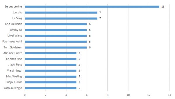 美国加州大学戴维斯分校教授 Cho-Jui Hsieh,多伦多大学助理教授 Jimmy Ba,北京大学信息科学技术学院教授王立威,DeepMind 首席科学家 Pushmeet Kohli,马里兰大学计算机系副教授 Tom Goldstein,分别各有 6 篇入选,并列第三位。