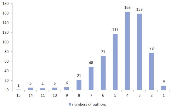 从每篇论文的作者个数来看,ICLR 2020 接收的论文大多都有 3-4 个作者,其中有 4 个作者的最多,共有 163 篇,3 个作者的共有 159 篇;拥有 10 个及以上作者的论文共有 15 篇,最多的 1 篇文章拥有 15 个作者。