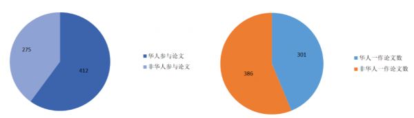 从作者所属国籍来看,华人参与的论文共有 412 篇,占总论文数的 60%。其中华人一作论文共有 301 篇,占华人参与论文数的 73%,占总论文数的 44%。
