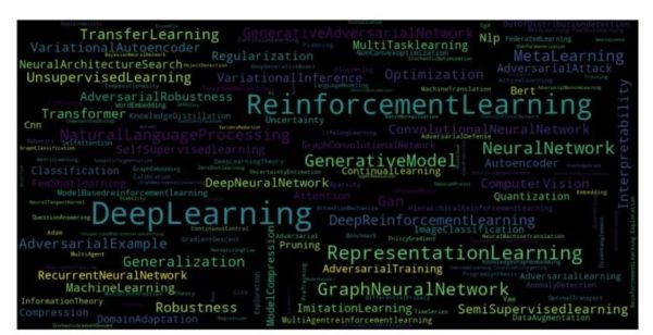 由投稿关键词生成的词云图,突出了深度学习、强化学习、表示学习、生成模型、图形神经网络等热点话题。