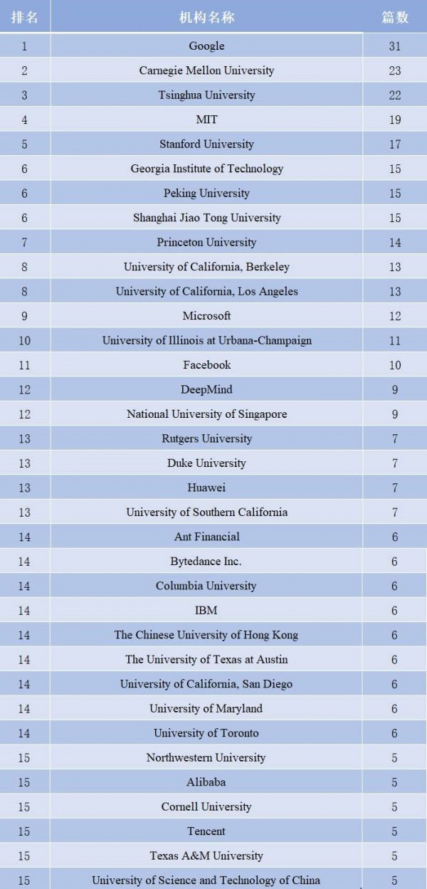 Google+DeepMind 以 40 篇论文入选,再次实力霸榜;位居第二的卡耐基梅隆大学,共有 23 篇入选;清华大学以 22 篇排在第三位。