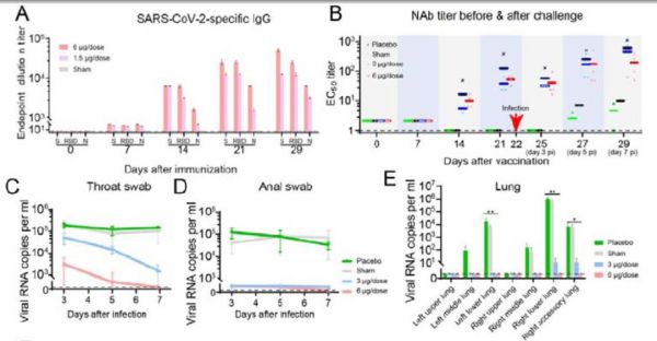 随后研究者在新冠病毒感染的恒河猴中进行了攻毒实验,以评估其免疫原性和保护功效。