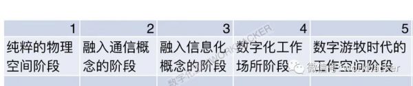 在《数字化工作WORKHACKER》看来,数字化时代的工作进化会包含工具、空间、理念多个层面,我们在此前关于数字化工作场所的系列文章里曾写到,我们把办公室/工作场所其迄今为止的进化分为五个阶段,分别是纯粹的物理空间阶段、融入通信概念的阶段、融入信息化概念的阶段、数字化工作场所阶段以及数字游牧时代的工作空间阶段。眼下,我们正处在从从第四阶段往第五阶段跃升的时期。