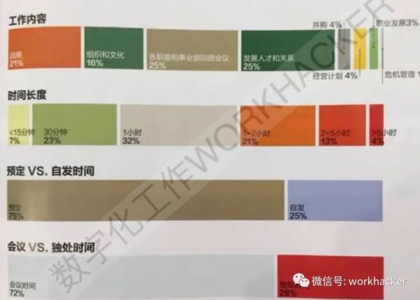 《哈佛商业评论》在2018年有一篇文章,专门探讨了CEO如何管理时间。其中提到:哈佛商学院跟踪了27位CEO近6万个小时的使用信息发现,CEO们在会议上花费的时间占其总工作时长的72%。CEO几乎要不间断的开会,而且下一场会议和上一场会议的内容会截然不同。会议的数量和种类几乎决定了最高职位的属性。CEO们平均每周要开37场会议。为了把工作和生活协调好,CEO们不得不在会议时长和参与人数上试图找到最佳方案。