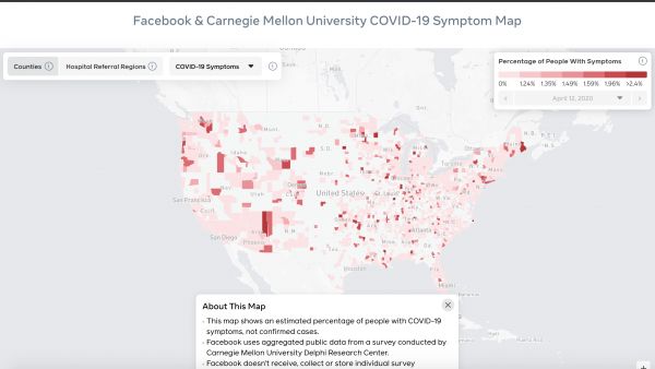 据CNBC当天报道,Facebook与卡内基梅隆大学的研究人员合作,创建了一项选择调查,设计目的是希望能在新冠病例确诊之前帮助辨别新冠肺炎的热点地区。该地图将每个县自我报告有新冠病毒症状的人群比例进行了细分,如味觉丧失、咳嗽和发烧。