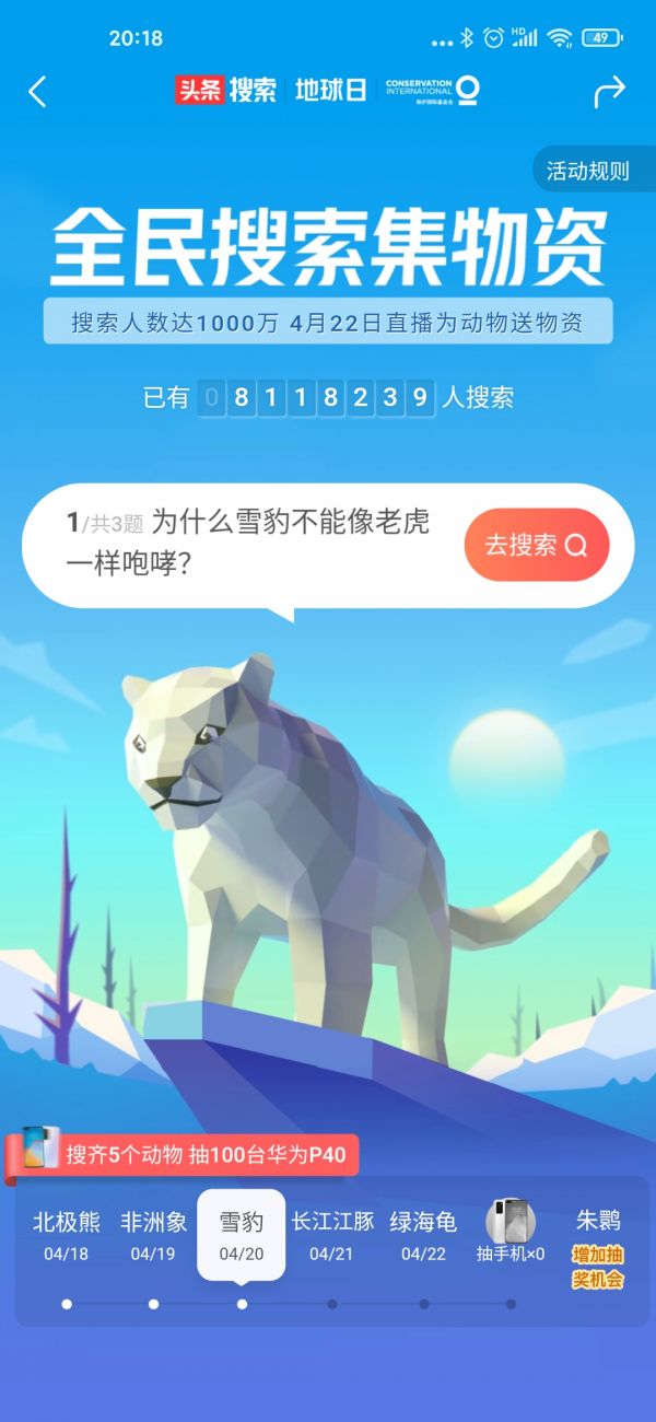 今日头条正在试图引导用户建立起头条内也能进行搜索、获取百科内容的用户心智。以近期上线的头条搜索“全民搜索集物资”活动为例,应用首页的搜索框变换视觉设计吸引用户,活动目标也都是进行关键词搜索或是查看百科词条这样的任务,并配以活动奖励等。