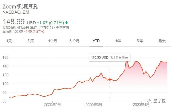 用户数暴增20倍,股价也一路狂飙,截至4月20日收盘,Zoom股价为148.99美元。