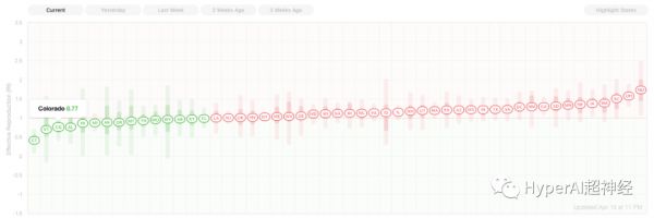 上周美国各州 Rt 值,绿色为表示小于 1,红色表示大于 1,南达科他州 Rt =2.1,为全国最高
