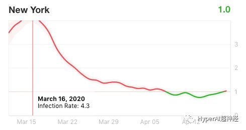 举个具体的例子。Rt.live 显示,纽约州由于积极的社交隔离令,Rt 已经下降到了 0.54。