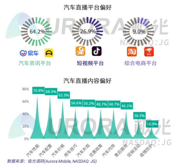 极光的调研结果显示,超过64.2%的用户选择汽车资讯平台观看汽车直播,最关心汽车性能、配置及价格。以易车为例,易车直播平台上除了积聚车圈KOL、经销商等行业人士外,还有明星等为汽车直播担任主播;涵盖了从选车、用车、养车等实用性的汽车资讯,到“汽车AR云上市”发布会,再到汽车电商导流、汽车导购等直播卖车的内容,满足不同消费人群的需求。