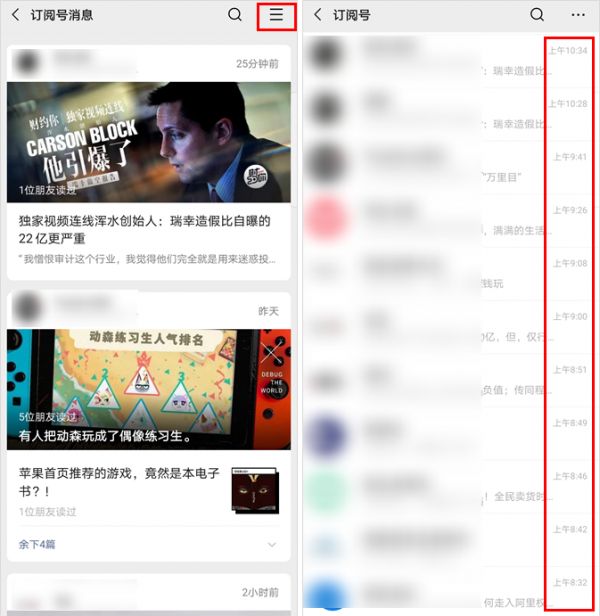 如果想要按照之前的时间顺序阅读依然还是可以的,在「订阅号消息」右上角可以切换到公众号列表形式,里面的内容就是按照时间顺序排列的。