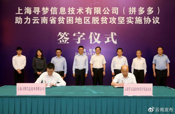 ▲2019年7月19日,拼多多和云南省政府签署助力云南省贫困地区脱贫攻坚实施协议。拼多多于2019年先期投入1亿元资金,在上海市对口帮扶的云南省13个州(市)74个贫困县,助力培育发展优势农产品并形成产业优势,打造让贫困户增收脱贫的可持续发展机制(图片来源:云南发布)