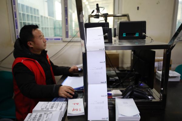 ▲渭南邮政,电商工作人员正在打单。消费者下单,邮件处理中心即打,工人在传送带上即贴,邮政的物流车装满即发。全流程多环节以秒计算,开创了领先全行业的秒发模式(图片来源:乔宇)