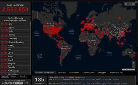 @环球网【美国新冠确诊病例超过82万例】据美国约翰斯·霍普金斯大学数据,截至美东时间21日17:38(北京时间22日5:38),美国新冠肺炎确诊病例增至820104例,死亡44228例。全球确诊病例已达2553853例,死亡总病例数为176323例。
