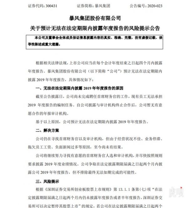 @虎嗅【暴风集团:因招不到 CFO 无法按期披露年报和 Q1 季报】暴风集团昨日晚间发布公告称,公司尚未完成聘任首席财务官的工作,现有员工无法承担2019年度报告的编制任务。