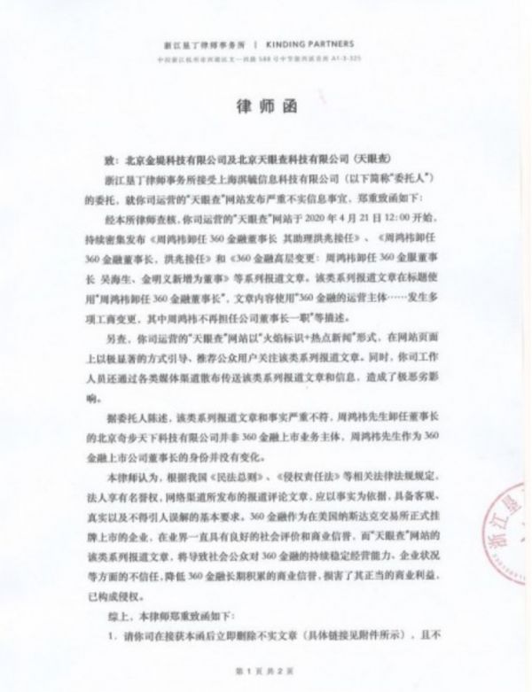 同时,360金融表示,已准备起诉天眼查,委托浙江垦丁律师事务所,以“天眼查”网站发布严重不实信息事宜为由,向北京金堤科技有限公司及北京天眼查科技有限公司发去律师函。