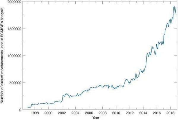 在过去20年里,ECMWF每天使用的飞机报数量大幅增加(图片来源:ECMWF官网)